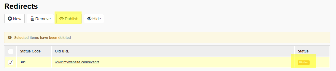- There are times where you may need to publish a Page that you created a Redirect from, using this as the Old/From URL. In this scenario you can Hide or Delete a Redirect with the Redirect list.