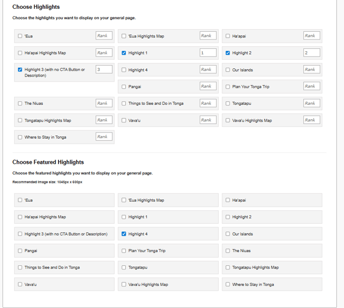 - Choose Highlights: It is recommended to select, by checking the tick box next to the title of a Highlight, a maximum of 3 or 4 Highlights to display on a page. These will be displayed at the bottom of the page underneath the primary page content with your set Title, Description and CTA Button. You are able to set a rank or number for the order that you would like your Highlights to appear in on the front end. In the example above, you can see that Highlights 1 - 3 have been set in ascending order.