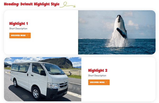 - Default: This displays a stand-alone image that takes up 50 per cent of the right-hand side of the Highlight, with a Title, Description, and a CTA button that takes up the other 50 per cent of the space. The image, Title, and CTA button when clicked, will direct the user to the page of the URL that has been set. The Default option displays the first Highlight with an image on the right-hand side, and a second Highlight with an image on the left-hand side, with all subsequent Highlight alternating