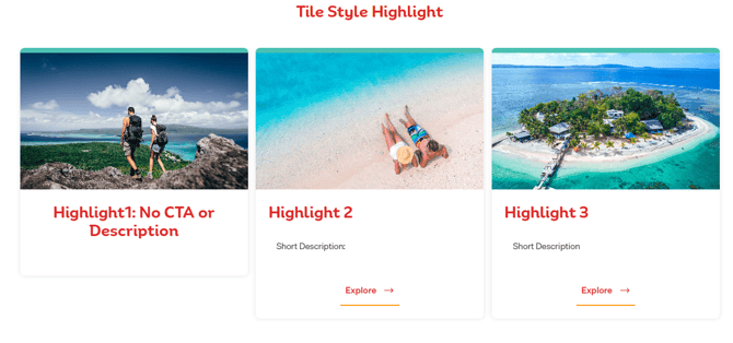 - Tile: This displays an image at the top of the Highlight, with a Title, Description, and a CTA button that takes up the bottom 50 per cent of the space, in a column format. The image, Title, and CTA button when clicked, will direct the user to the page of the URL that has been set. The Tile option displays 3 Highlights in one row. Adding a fourth Highlight will add navigation arrows to the left and the right of this section to allow a user to click through a carousel. The carousel automatically progresses through all Highlights when more than 3 Highlights have been selected.