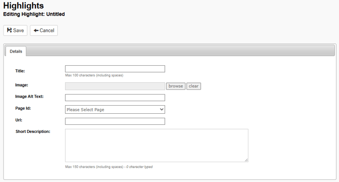 - Title: This is the name of the Highlight that will appear on the front end, and within the CMS as the title, and is limited to 100 characters including spaces.