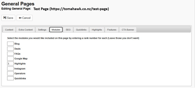 - Remember that once you have selected the Highlights you want to display on a page within the Highlights tab, you will then need to set a rank next to the Highlights module, within the Modules tab for the page you are working on.