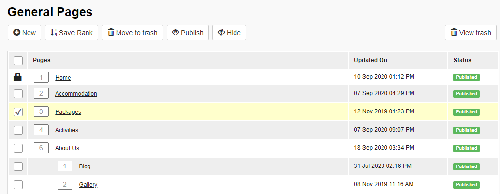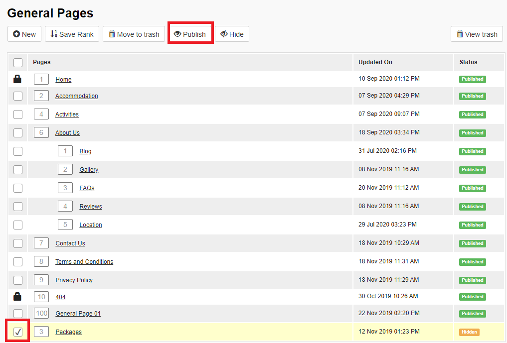2. The reinstated page will appear in the list of the Pages as Hidden. For it to be accessible on the website, tick the checkbox next to the page and click publish: