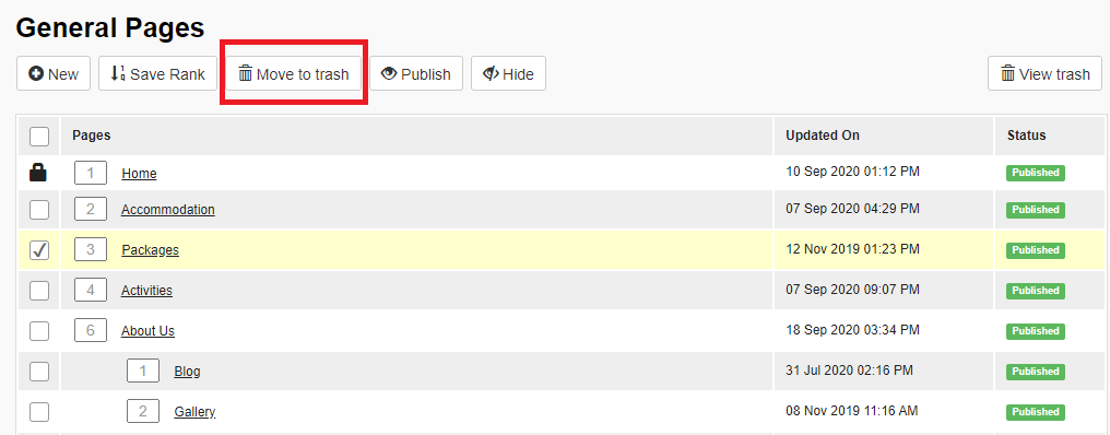3. Now this page will be deleted and will no longer show on the website. It will be moved to the Trash folder that can be accessed by clicking "View Trash" button: