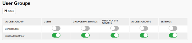To update the permission level for each of these Access Groups, head to the General Settings section of the CMS, then select Usergroups. You will be presented with options to toggle on or off how much access you would like each CMS user to have.