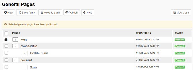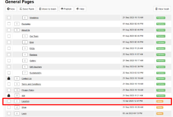- The final step is to set the order of where you would like the page to display within the topline navigation, so we need to set the Rank. Our newly created Location page will not appear in the topline navigation until you have set a rank, or the order in which this will display within the topline navigation. In the example above you will see that Accommodation has a rank of 2, and Restaurant has a rank of 3. We want Location to appear in the topline navigation in between Accommodation and Restaurant, so we will set a new order as Accommodation =2, Location =3, Restaurant =4, Occasions =5, Packages =6, etc., then select Save Rank at the top of the page to save your changes.