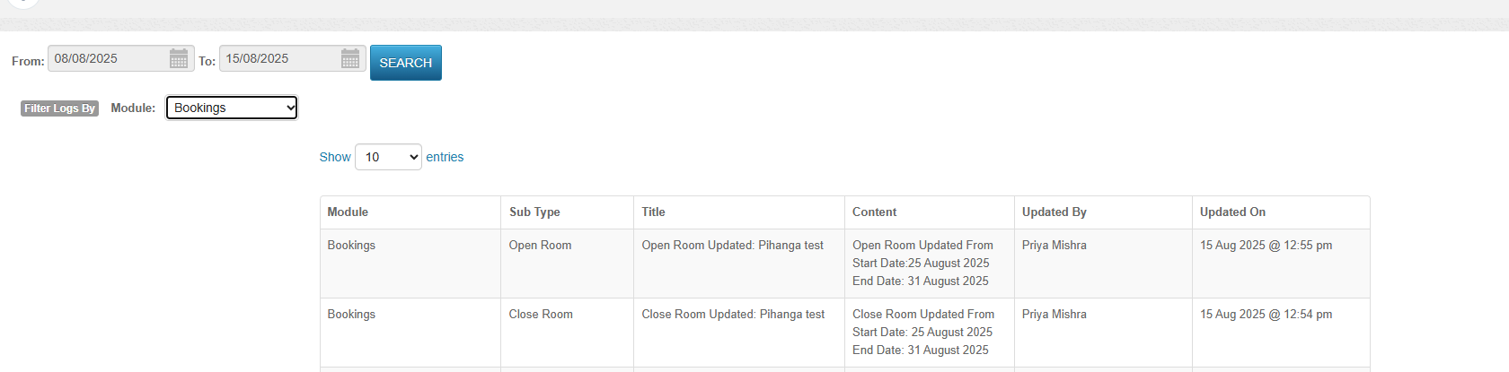 You can track room open and close actions directly in the user activity logs. Every time a room is opened or closed, the system will automatically capture: