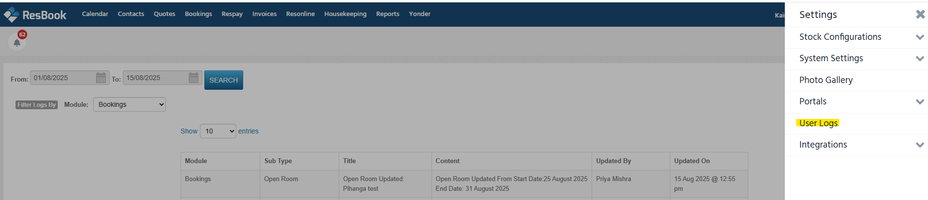 How To See ResBook PMS User Logs for Room Open and Close Actions